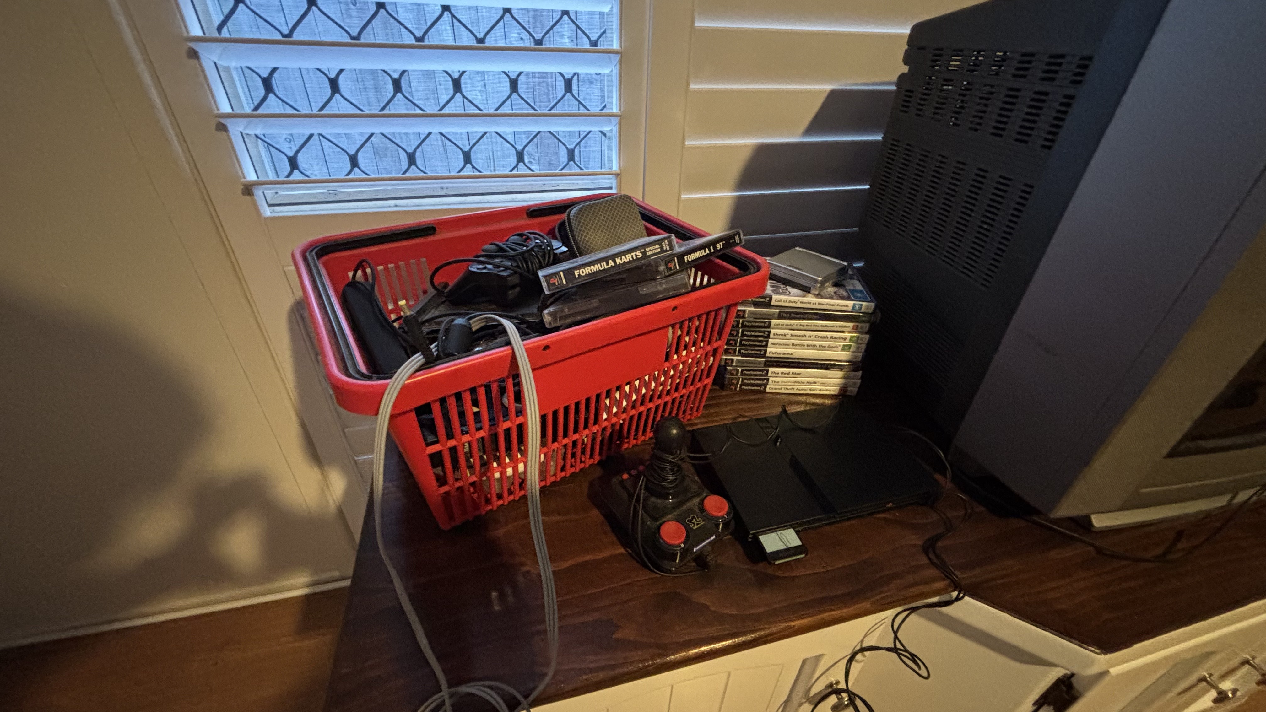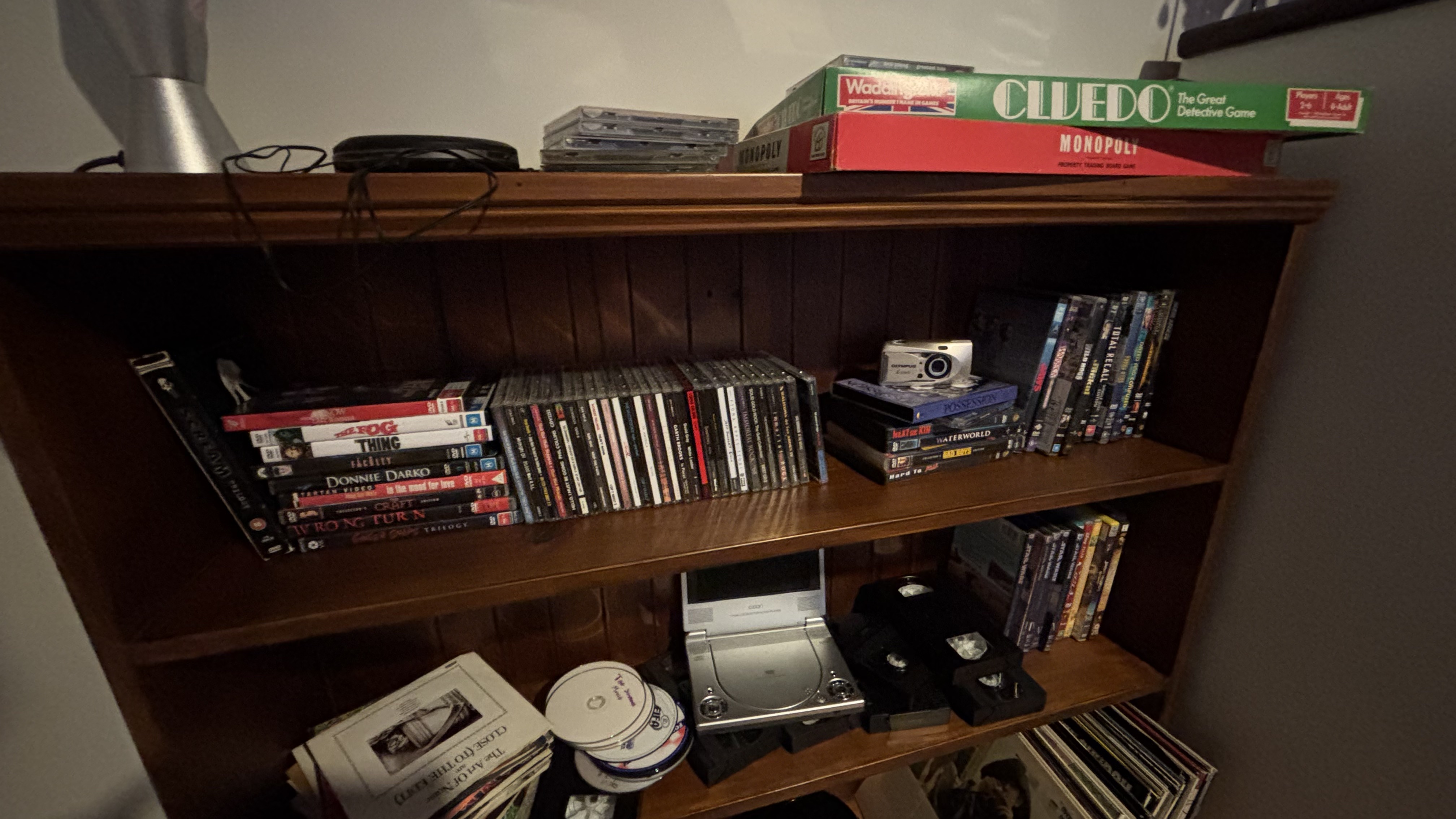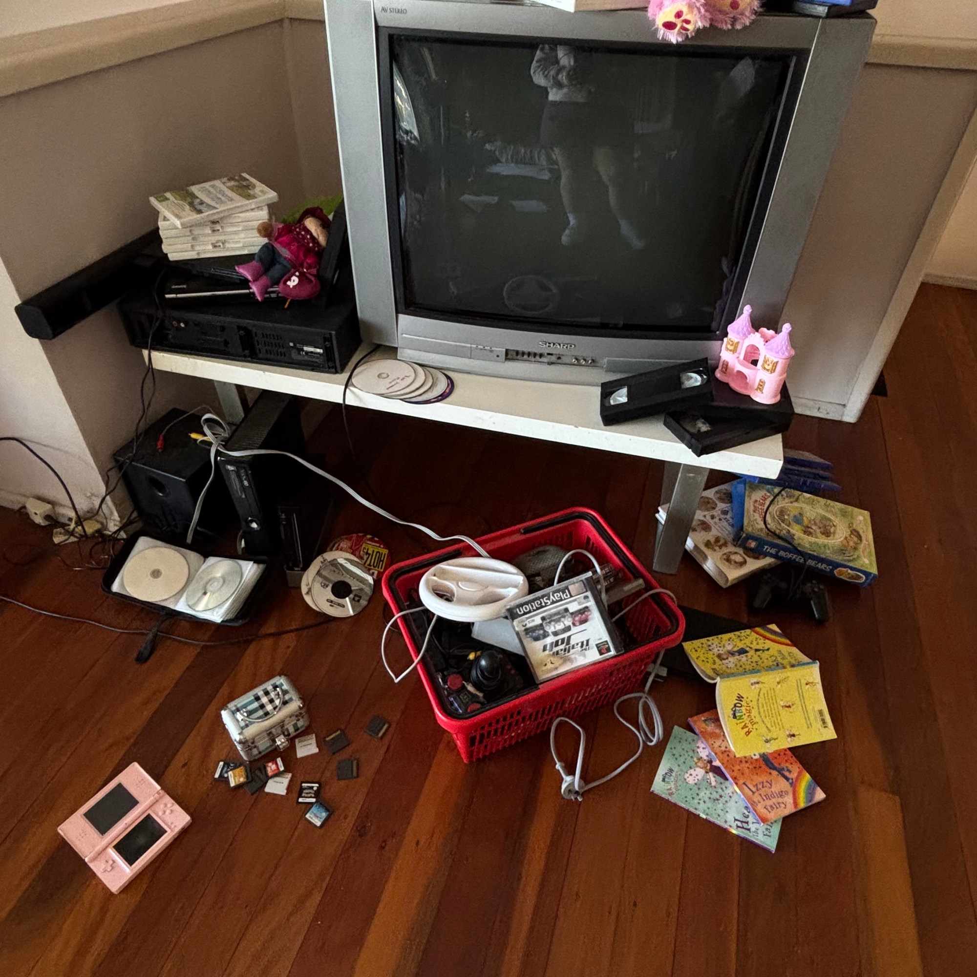 a young adult’s lounge room, centred around the box television. consoles and discs fill the spaces to show a numerous, but not messy, look.